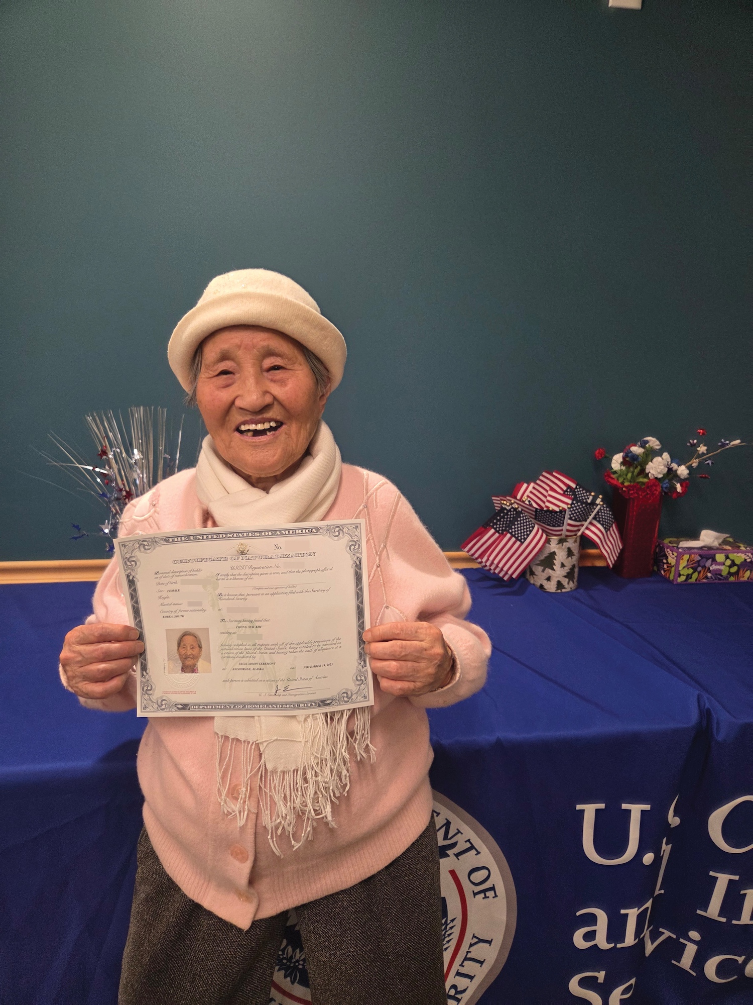 노인 Seniors 이벤트 Events 가족과 성실, 그리고 평생의 인내로 이룬 결실 99세 김정숙 씨, 미국 시민권 취득 · 99-Year-Old (Jung Suk Kim) Becomes a U.S. Citizen After a Lifetime of Family, Hard Work, and Resilience